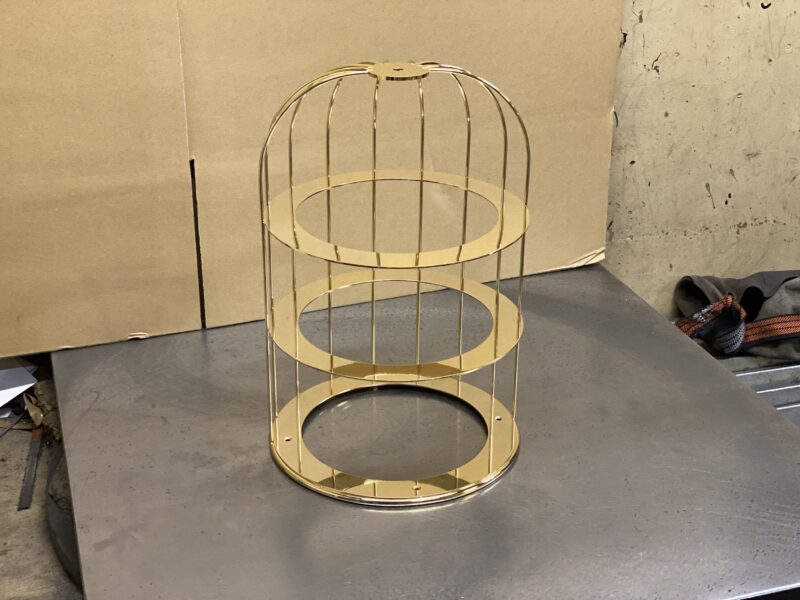 (有)アートフィールド様はディスプレイ関係などで幅広く仕事をされている会社です。お付き合いをさせていただいて1年半位になりますが、照明のフレームの仕事とはまた違った形のものを注文いただいて、毎回よりきれいな品物を作るために、照明金枠の経験を活かしながら、新たな考えをプラスして、試行錯誤しながら楽しみながら製造しております。